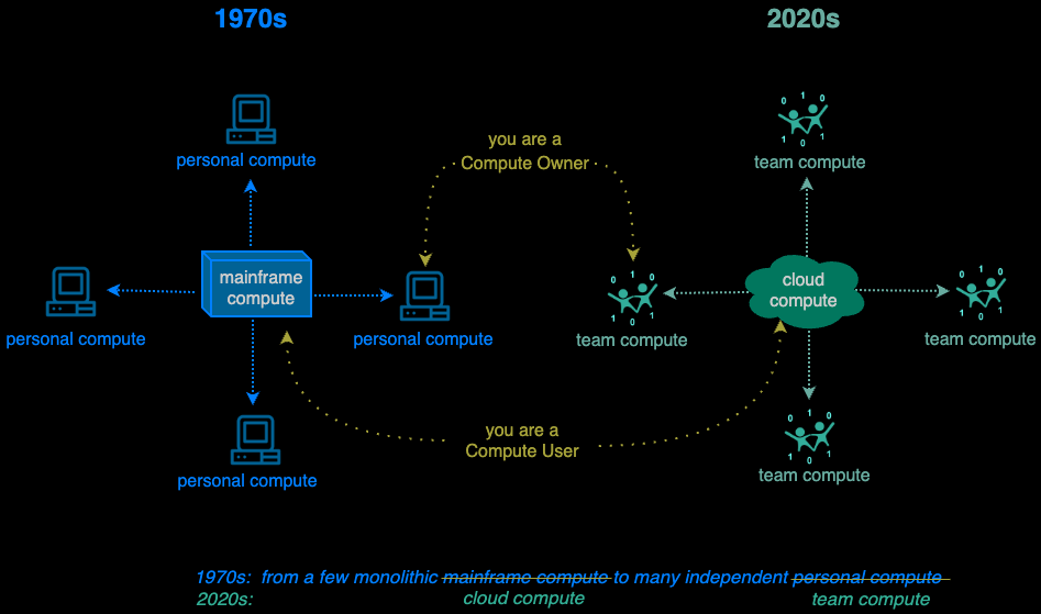 In the 1970s, Personal Compute enables mass compute ownership, ending Mainframe Compute‘s monopoly in computing.