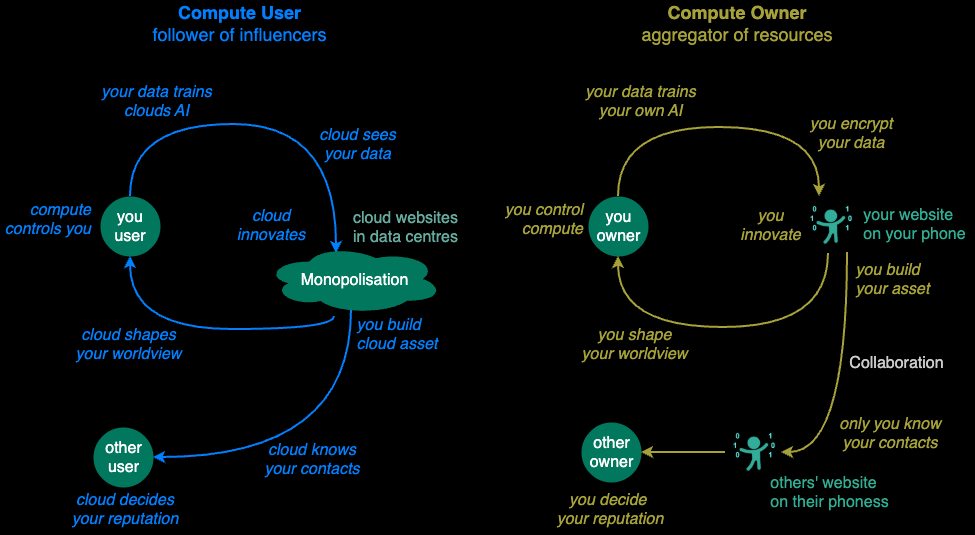 The same companies that made Personal Compute ownership affordable in the 1970s now own the compute themselves, users have no choice but to provide data to them for processing, thus losing all their data related prosperities and opportunities to Cloud Compute.