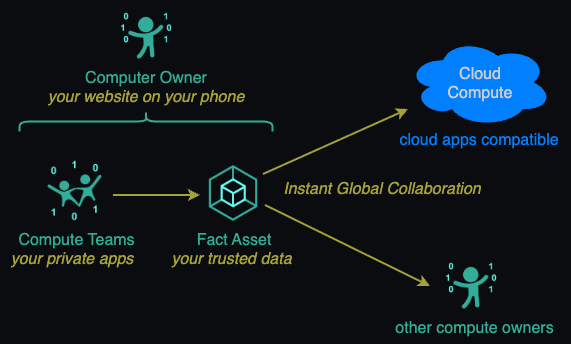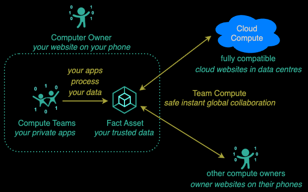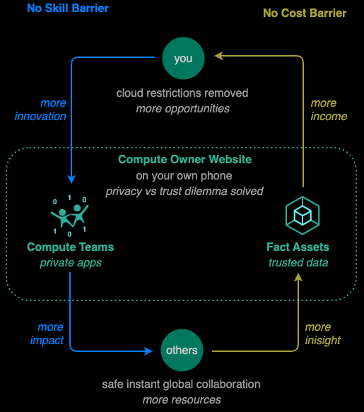 Compute Owner Website removes the COST barriers to mass compute ownership, enabling everyone, no matter their wealth, to profit from their data through Fact Assets worldwide directly (without depending on cloud platforms) in a TRUSTED manner under the control of their own phones.