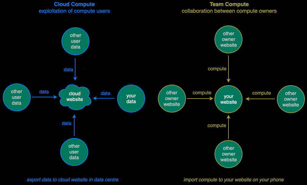 Team Compute enables individuals to assemble their own Apps in their private websites on their phones with many different independent Compute Teams thus preventing exposure of their data to a single party (e.g. mobile app or app store).